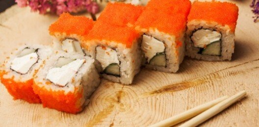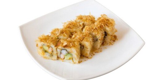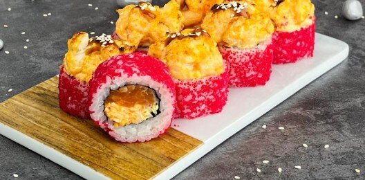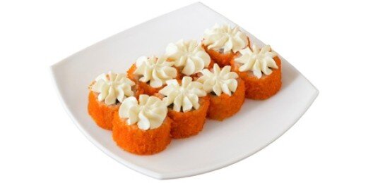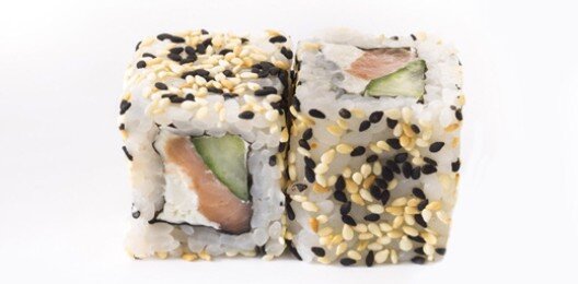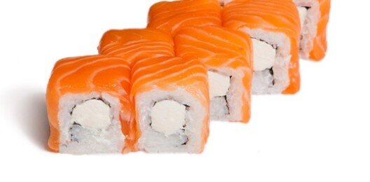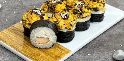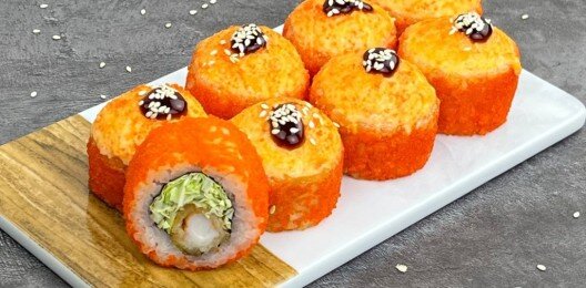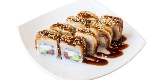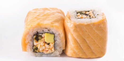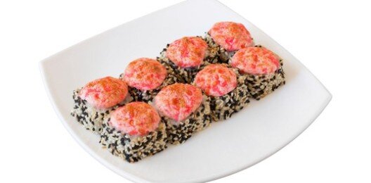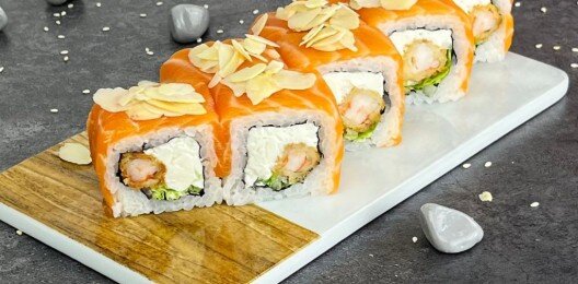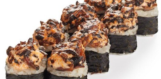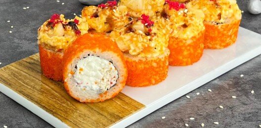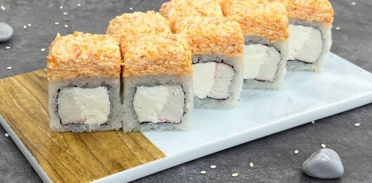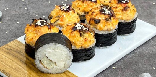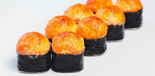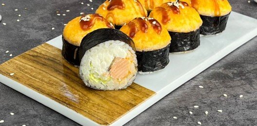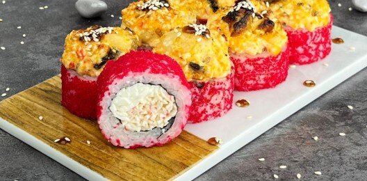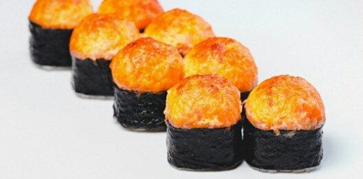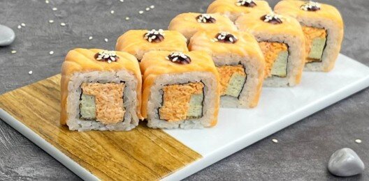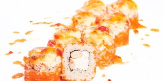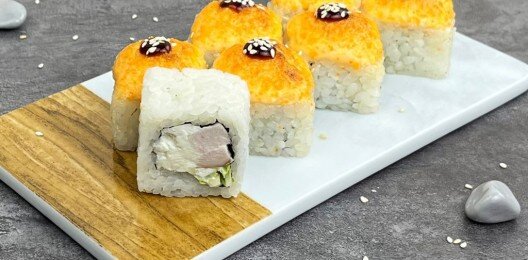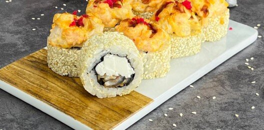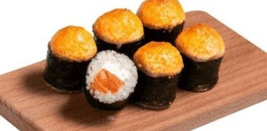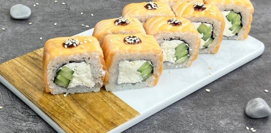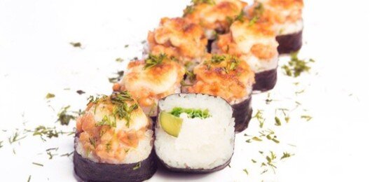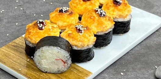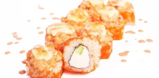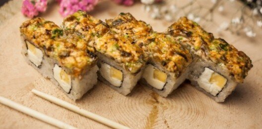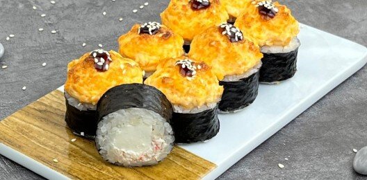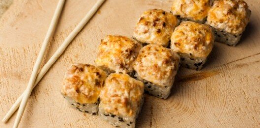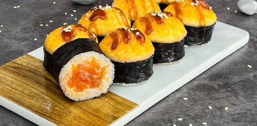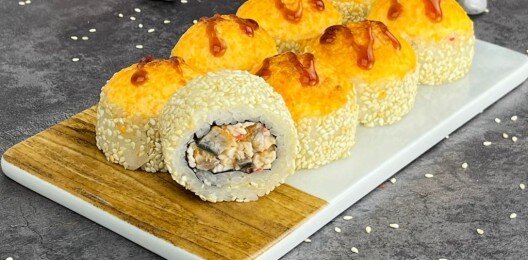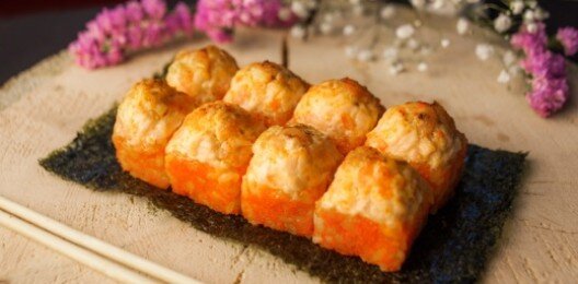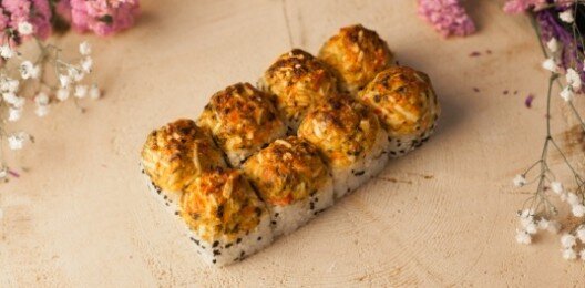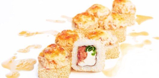 Мини ролл с лососем и сливочным сыром, запекается под сырным соусом